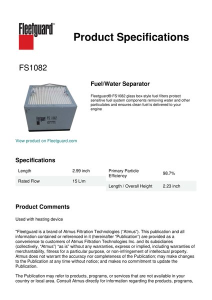Fleetguard® FS1082 glass box-style fuel filters protect sensitive fuel system components removing water and other particulates and ensures clean fuel is delivered to your engineSpecification
