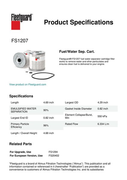 Fleetguard® FS1207 fuel water separator cartridge filter works to remove water and other particulates and ensures clean fuel is delivered to your engine.Specification