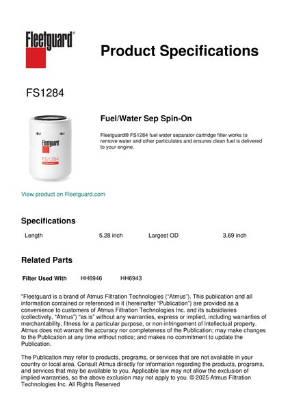 Fleetguard® FS1284 fuel water separator cartridge filter works to remove water and other particulates and ensures clean fuel is delivered to your engine.Specification