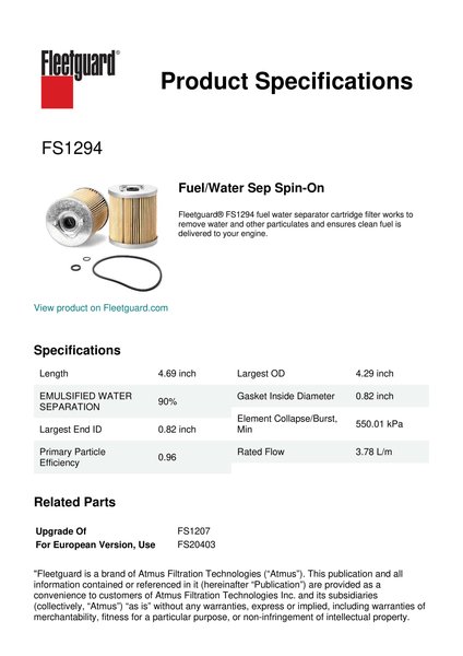 Fleetguard® FS1294 fuel water separator cartridge filter works to remove water and other particulates and ensures clean fuel is delivered to your engine.Specification