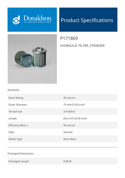 Genuine Donaldson P171869 Hydraulic Filter, Strainer is designed to capture larger contaminants before they enter the hydraulic system, protecting sensitive components from damage. Its coarse filtration capability helps extend the life of downstream filters and improves overall system performance.Ideal for low-pressure applications, this strainer offers durable construction and easy installation. It’s a cost-effective solution for maintaining hydraulic fluid cleanliness and preventing clogging in pumps and valves.