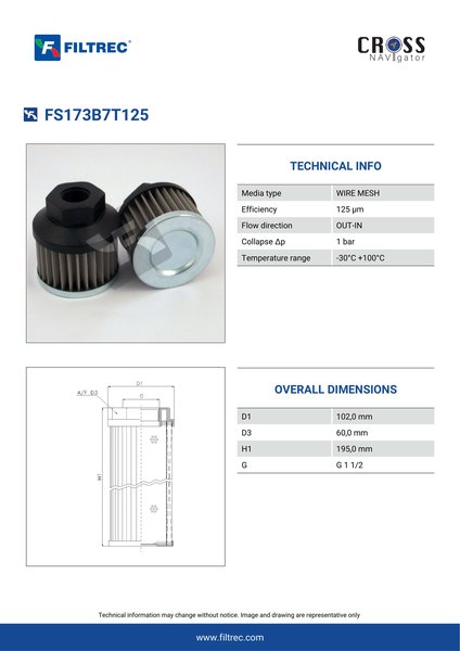 Genuine Filtrec FS173B7T125. This Filtrec element is designed to meet or exceed the quality and performance of brand OEM’s ensuring superior filtration performance and long-lasting durability.Engineered with their high performance media and a durable design, the FS173B7T125 provides reliable and consistent performance over its lifespan, even in harsh operating environments. When you order from FilterFinder, you can trust that you are getting a reliable and high-quality replacement filter that will keep your system running smoothly.