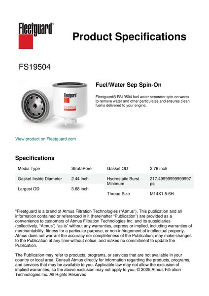 Fleetguard® FS19504 fuel water separator spin-on works to remove water and other particulates and ensures clean fuel is delivered to your engine.Specification