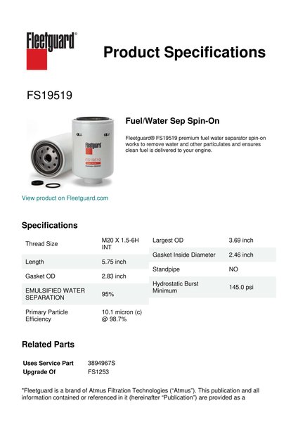 Fleetguard® FS19519 premium fuel water separator spin-on works to remove water and other particulates and ensures clean fuel is delivered to your engine.Specification