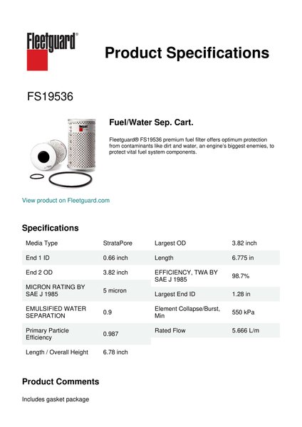 Fleetguard® FS19536 premium fuel filter offers optimum protection from contaminants like dirt and water, an engine’s biggest enemies, to protect vital fuel system components.Specification