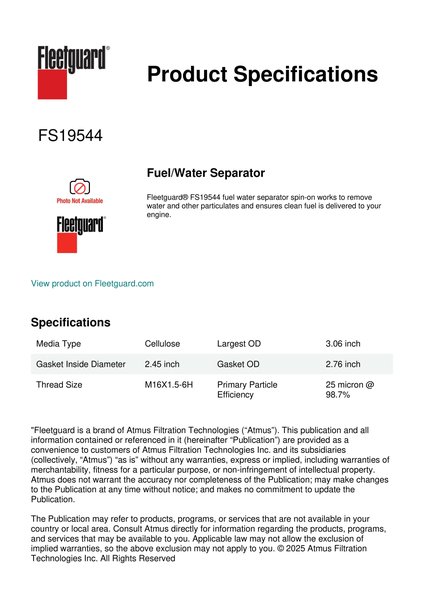 Fleetguard® FS19544 fuel water separator spin-on works to remove water and other particulates and ensures clean fuel is delivered to your engine.Specification