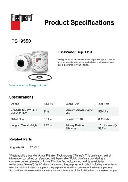 Fleetguard® FS19550 fuel water separator spin-on works to remove water and other particulates and ensures clean fuel is delivered to your engine.Specification