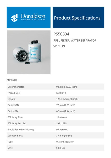Genuine Donaldson P550834 Fuel Filter, Water Separator Spin-On is designed to remove contaminants and separate water from diesel fuel, safeguarding your engine against corrosion and injector damage. It ensures clean fuel delivery, enhancing engine efficiency and supporting reliable performance in diesel applications.