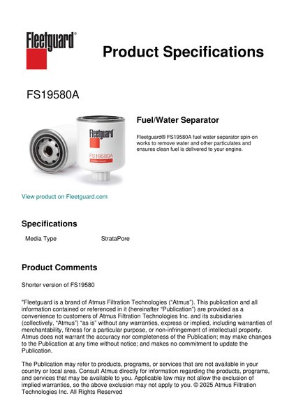Fleetguard® FS19580A fuel water separator spin-on works to remove water and other particulates and ensures clean fuel is delivered to your engine.Specification