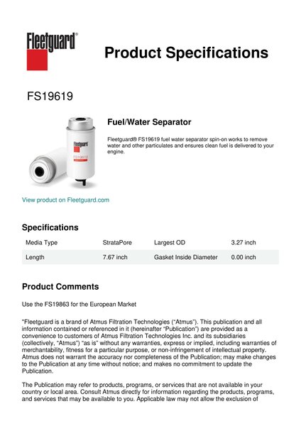 Fleetguard® FS19619 fuel water separator spin-on works to remove water and other particulates and ensures clean fuel is delivered to your engine.Specification