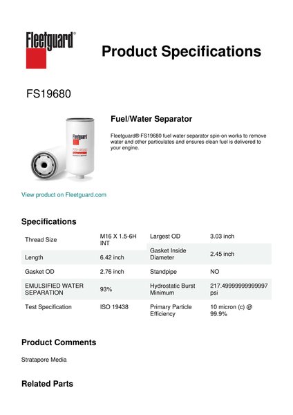 Fleetguard® FS19680 fuel water separator spin-on works to remove water and other particulates and ensures clean fuel is delivered to your engine.Specification