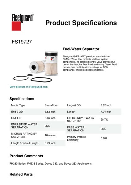 Fleetguard® FS19727 premium standard size EleMax™ fuel filter protects vital fuel system components. Its patented control valve provides full use of the filter, fits Fuel Pro® and many Diesel Pro® models, has multiple micron ratings for OEM compliance, and is biodiesel compatible.Specification
