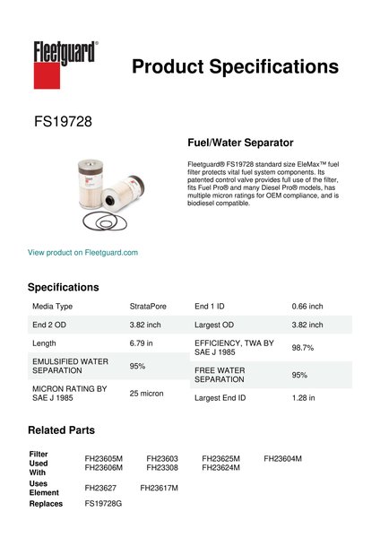 Fleetguard® FS19728 standard size EleMax™ fuel filter protects vital fuel system components. Its patented control valve provides full use of the filter, fits Fuel Pro® and many Diesel Pro® models, has multiple micron ratings for OEM compliance, and is biodiesel compatible.Specification