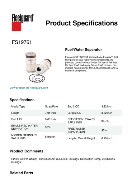 Fleetguard® FS19761 standard size EleMax™ fuel filter protects vital fuel system components. Its patented control valve provides full use of the filter, fits Fuel Pro® and many Diesel Pro® models, has multiple micron ratings for OEM compliance, and is biodiesel compatible.Specification