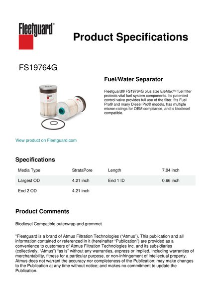 Fleetguard® FS19764G plus size EleMax™ fuel filter protects vital fuel system components. Its patented control valve provides full use of the filter, fits Fuel Pro® and many Diesel Pro® models, has multiple micron ratings for OEM compliance, and is biodiesel compatible.Specification