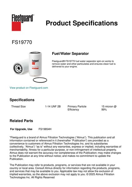 Fleetguard® FS19770 fuel water separator spin-on works to remove water and other particulates and ensures clean fuel is delivered to your engine.Specification