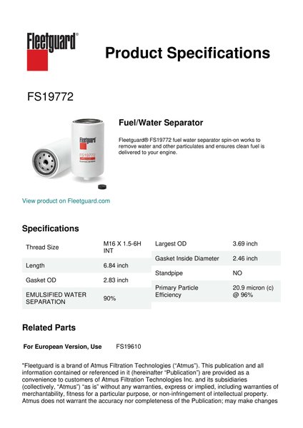 Fleetguard® FS19772 fuel water separator spin-on works to remove water and other particulates and ensures clean fuel is delivered to your engine.Specification