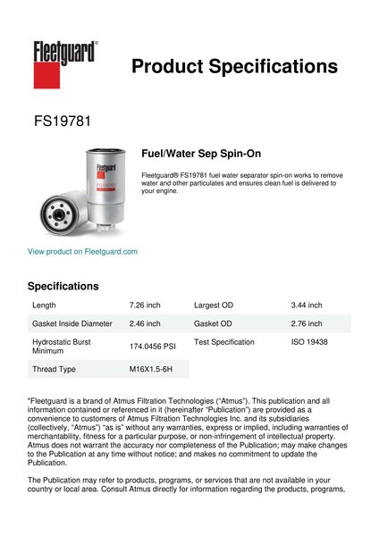 Fleetguard® FS19781 fuel water separator spin-on works to remove water and other particulates and ensures clean fuel is delivered to your engine.Specification