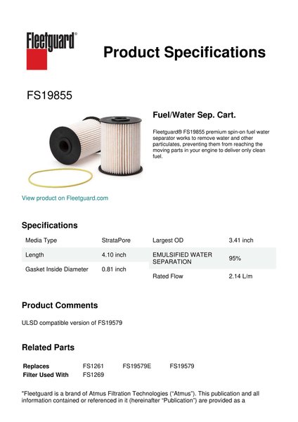 Fleetguard® FS19855 premium spin-on fuel water separator works to remove water and other particulates, preventing them from reaching the moving parts in your engine to deliver only clean fuel.Specification