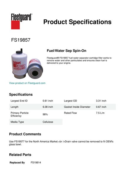Fleetguard® FS19857 fuel water separator cartridge filter works to remove water and other particulates and ensures clean fuel is delivered to your engine.Specification