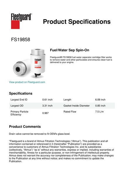 Fleetguard® FS19858 fuel water separator cartridge filter works to remove water and other particulates and ensures clean fuel is delivered to your engine.Specification