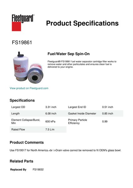 Fleetguard® FS19861 fuel water separator cartridge filter works to remove water and other particulates and ensures clean fuel is delivered to your engine.Specification