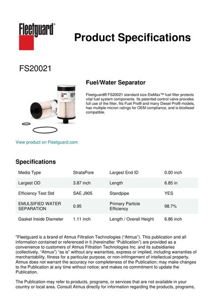 Fleetguard® FS20021 standard size EleMax™ fuel filter protects vital fuel system components. Its patented control valve provides full use of the filter, fits Fuel Pro® and many Diesel Pro® models, has multiple micron ratings for OEM compliance, and is biodiesel compatible.Specification