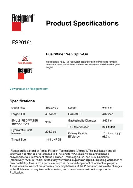 Fleetguard® FS20161 fuel water separator spin-on works to remove water and other particulates and ensures clean fuel is delivered to your engine.Specification