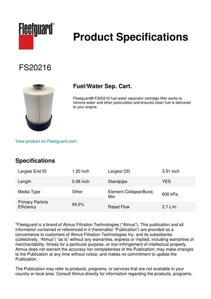 Fleetguard® FS20216 fuel water separator cartridge filter works to remove water and other particulates and ensures clean fuel is delivered to your engine.Specification
