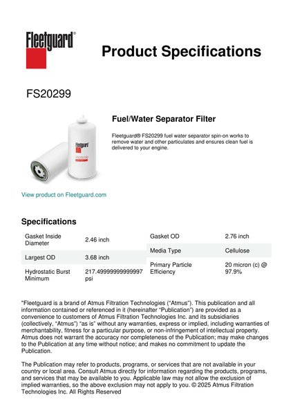 Fleetguard® FS20299 fuel water separator spin-on works to remove water and other particulates and ensures clean fuel is delivered to your engine.Specification