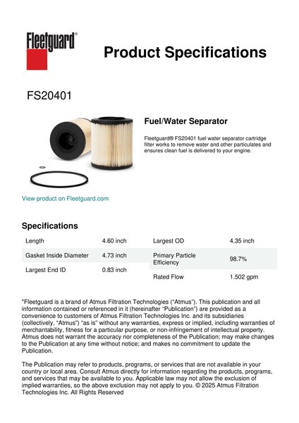 Fleetguard® FS20401 fuel water separator cartridge filter works to remove water and other particulates and ensures clean fuel is delivered to your engine.Specification