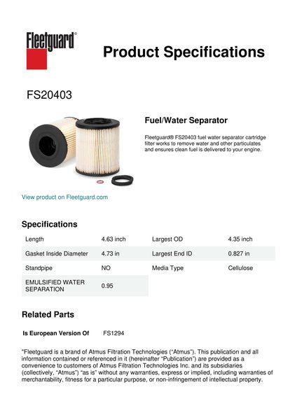 Fleetguard® FS20403 fuel water separator cartridge filter works to remove water and other particulates and ensures clean fuel is delivered to your engine.Specification