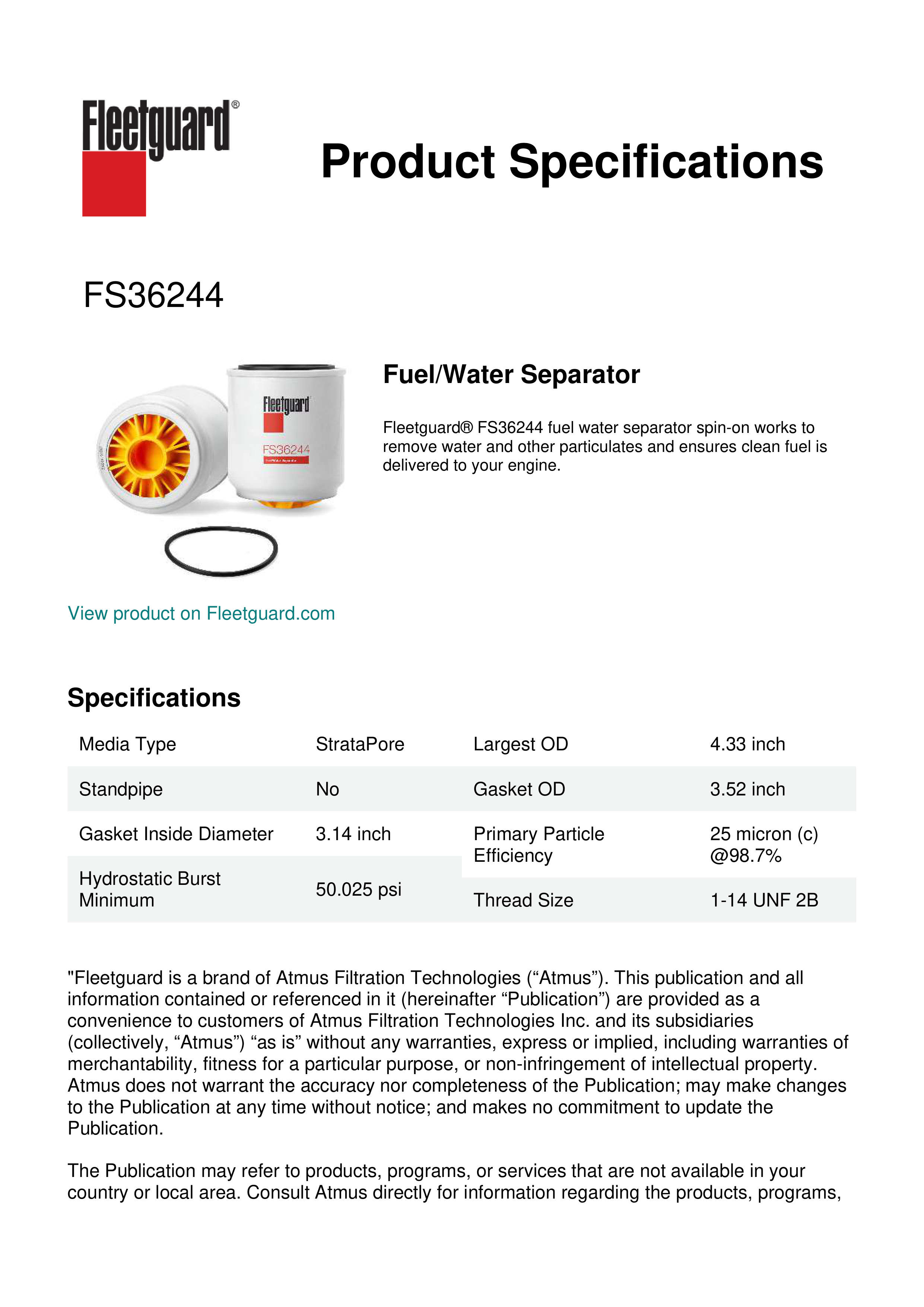 Fleetguard® FS36244 fuel water separator spin-on works to remove water and other particulates and ensures clean fuel is delivered to your engine.Specification