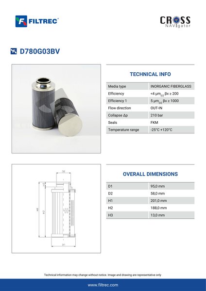 Genuine Filtrec D780G03BV. This Filtrec element is designed to meet or exceed the quality and performance of brand OEM’s ensuring superior filtration performance and long-lasting durability.Engineered with their high performance media and a durable design, the D780G03BV provides reliable and consistent performance over its lifespan, even in harsh operating environments. When you order from FilterFinder, you can trust that you are getting a reliable and high-quality replacement filter that will keep your system running smoothly.