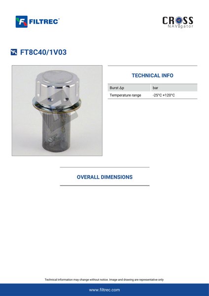 Genuine Filtrec FT8C40/1V03. This Filtrec element is designed to meet or exceed the quality and performance of brand OEM’s ensuring superior filtration performance and long-lasting durability.