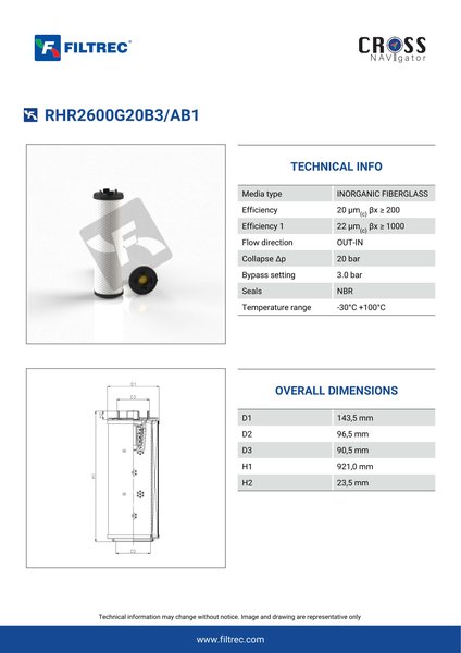 Filtrec RHR2600G20B3/AB1 Replaces the Filtration Group H2600RN2020V3,0