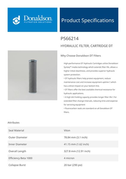 Genuine Donaldson P566214 Hydraulic Filter, Cartridge Dt is engineered with advanced depth filtration technology, offering enhanced dirt retention and fluid cleanliness. It ensures optimal performance in high-pressure hydraulic systems, effectively protecting critical components from wear and extending system life.