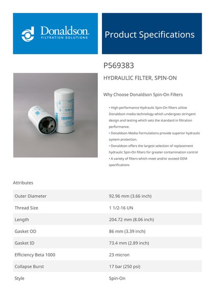 Genuine Donaldson P569383 Hydraulic Filter, Spin-On provides dependable protection for hydraulic systems by efficiently removing particulates and contaminants. It ensures clean hydraulic fluid, promoting smooth operation and extending the lifespan of critical system components.