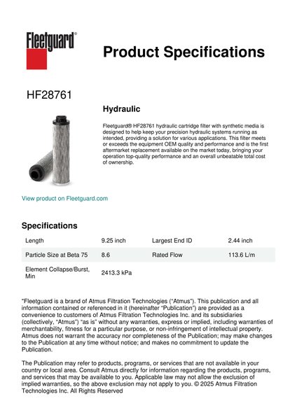 Fleetguard® HF28761 hydraulic cartridge filter with synthetic media is designed to help keep your precision hydraulic systems running as intended, providing a solution for various applications. This filter meets or exceeds the equipment OEM quality and performance and is the first aftermarket replacement available on the market today, bringing your operation top-quality performance and an overall unbeatable total cost of ownership.Specification