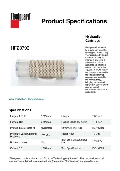 Fleetguard® HF28796 hydraulic cartridge filter is designed to help keep your precision hydraulic systems running as intended, providing a solution for various applications. This filter meets or exceeds the equipment OEM quality and performance and is the first aftermarket replacement available on the market today, bringing your operation top-quality performance and an overall unbeatable total cost of ownership.Specification