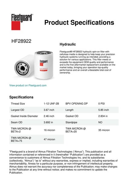 Fleetguard® HF28922 hydraulic spin-on filter with cellulose media is designed to help keep your precision hydraulic systems running as intended, providing a solution for various applications. This filter meets or exceeds the equipment OEM quality and performance and is the first aftermarket replacement available on the market today, bringing your operation top-quality performance and an overall unbeatable total cost of ownership.Specification