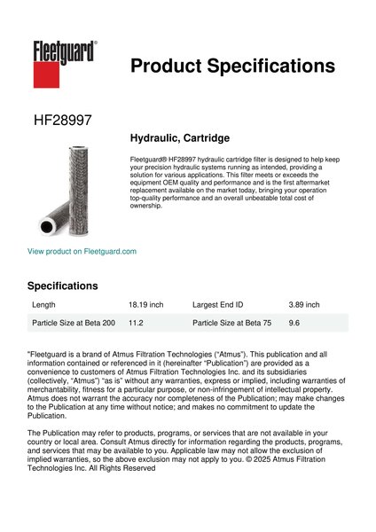 Fleetguard® HF28997 hydraulic cartridge filter is designed to help keep your precision hydraulic systems running as intended, providing a solution for various applications. This filter meets or exceeds the equipment OEM quality and performance and is the first aftermarket replacement available on the market today, bringing your operation top-quality performance and an overall unbeatable total cost of ownership.