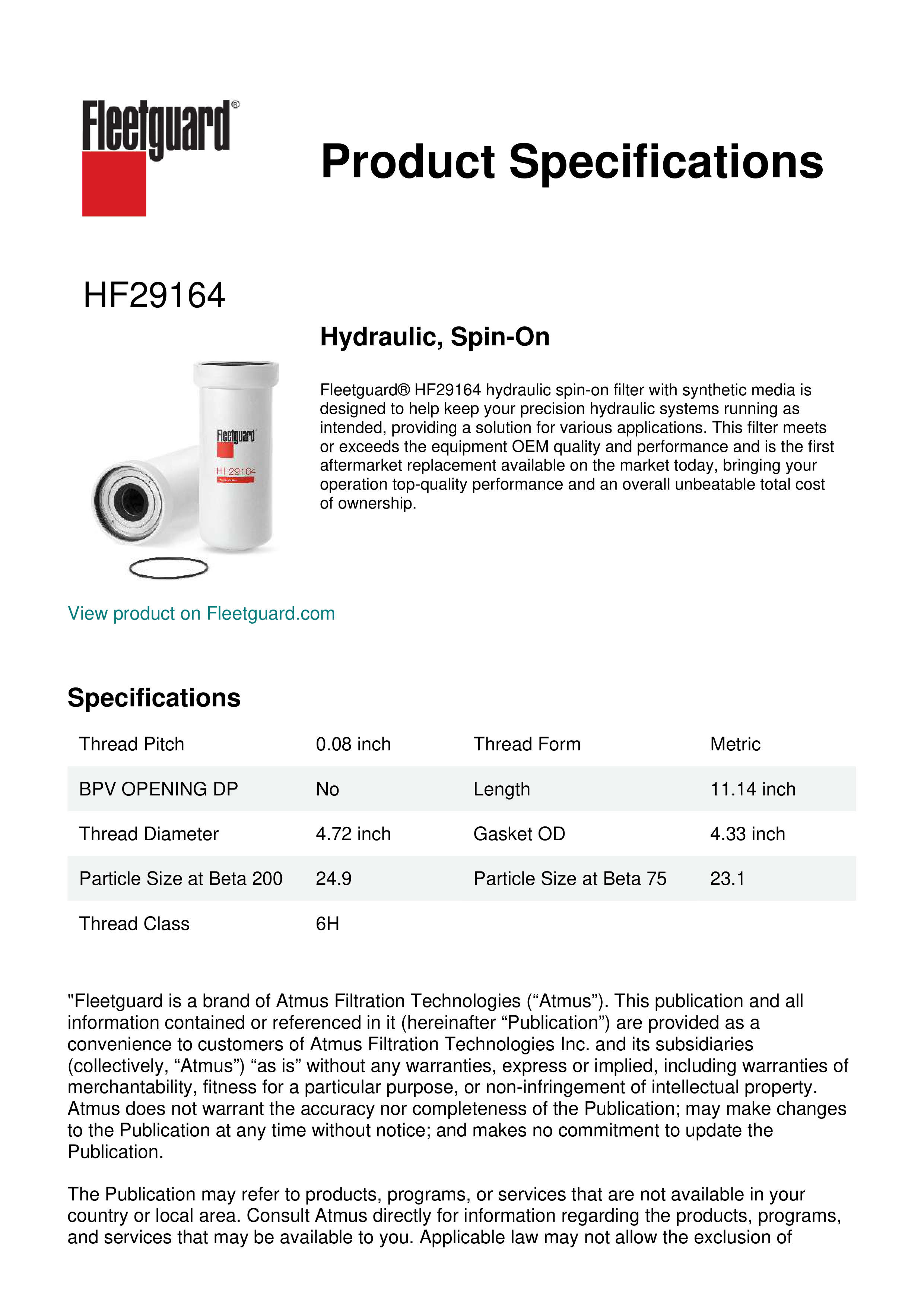 Fleetguard® HF29164 hydraulic spin-on filter with synthetic media is designed to help keep your precision hydraulic systems running as intended, providing a solution for various applications. This filter meets or exceeds the equipment OEM quality and performance and is the first aftermarket replacement available on the market today, bringing your operation top-quality performance and an overall unbeatable total cost of ownership.Specification