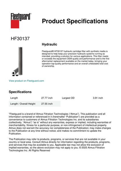 Fleetguard® HF30137 hydraulic cartridge filter with synthetic media is designed to help keep your precision hydraulic systems running as intended, providing a solution for various applications. This filter meets or exceeds the equipment OEM quality and performance and is the first aftermarket replacement available on the market today, bringing your operation top-quality performance and an overall unbeatable total cost of ownership.Specification