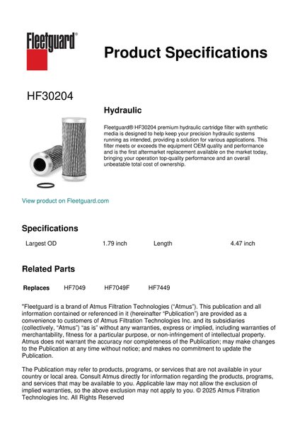 Fleetguard® HF30204 premium hydraulic cartridge filter with synthetic media is designed to help keep your precision hydraulic systems running as intended, providing a solution for various applications. This filter meets or exceeds the equipment OEM quality and performance and is the first aftermarket replacement available on the market today, bringing your operation top-quality performance and an overall unbeatable total cost of ownership.Specification