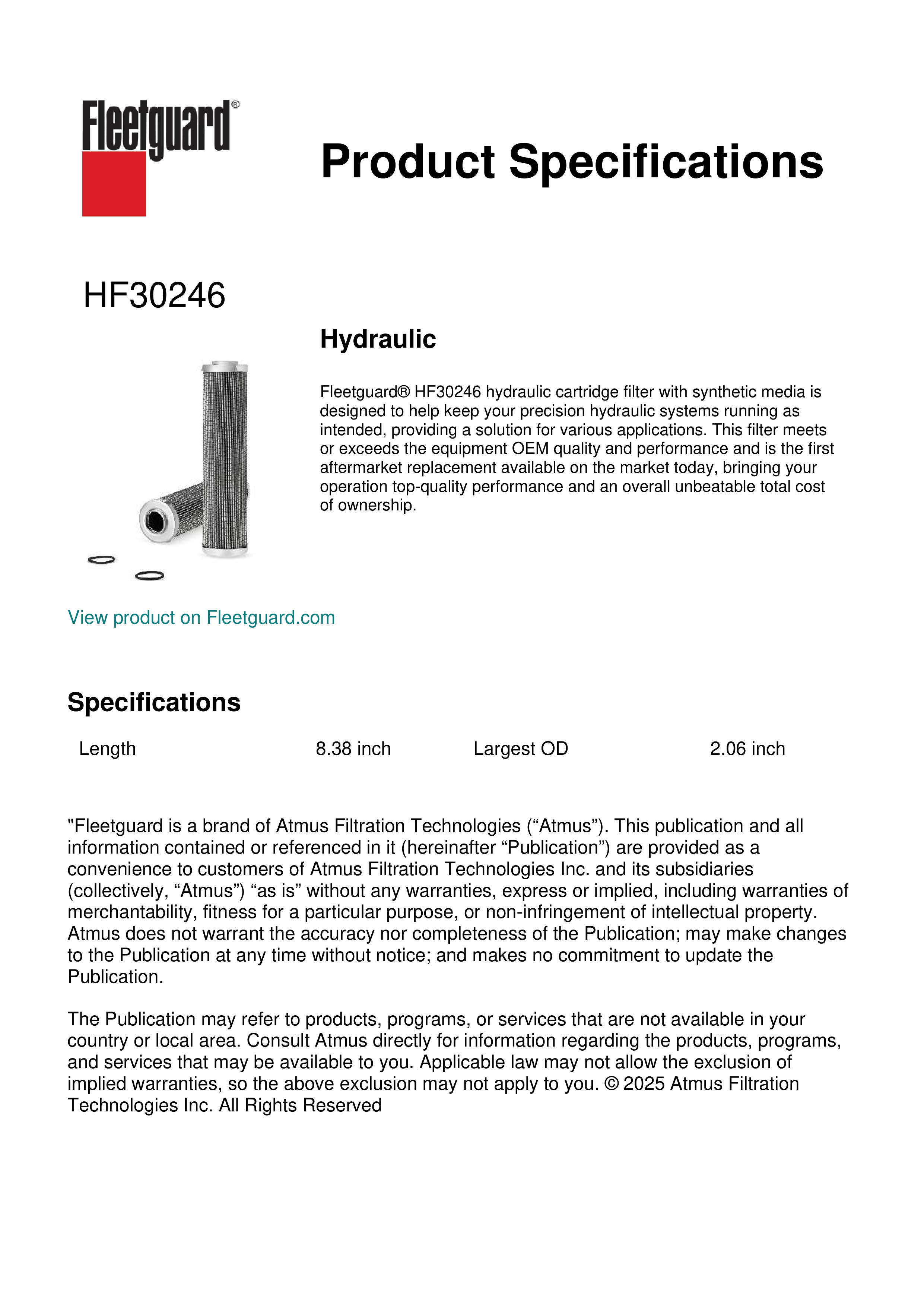Fleetguard® HF30246 hydraulic cartridge filter with synthetic media is designed to help keep your precision hydraulic systems running as intended, providing a solution for various applications. This filter meets or exceeds the equipment OEM quality and performance and is the first aftermarket replacement available on the market today, bringing your operation top-quality performance and an overall unbeatable total cost of ownership.Specification