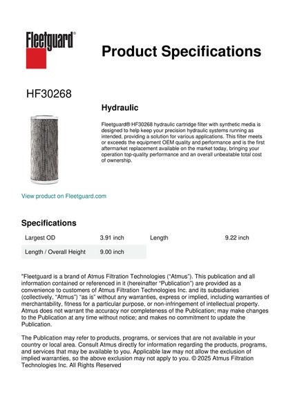 Fleetguard® HF30268 hydraulic cartridge filter with synthetic media is designed to help keep your precision hydraulic systems running as intended, providing a solution for various applications. This filter meets or exceeds the equipment OEM quality and performance and is the first aftermarket replacement available on the market today, bringing your operation top-quality performance and an overall unbeatable total cost of ownership.Specification