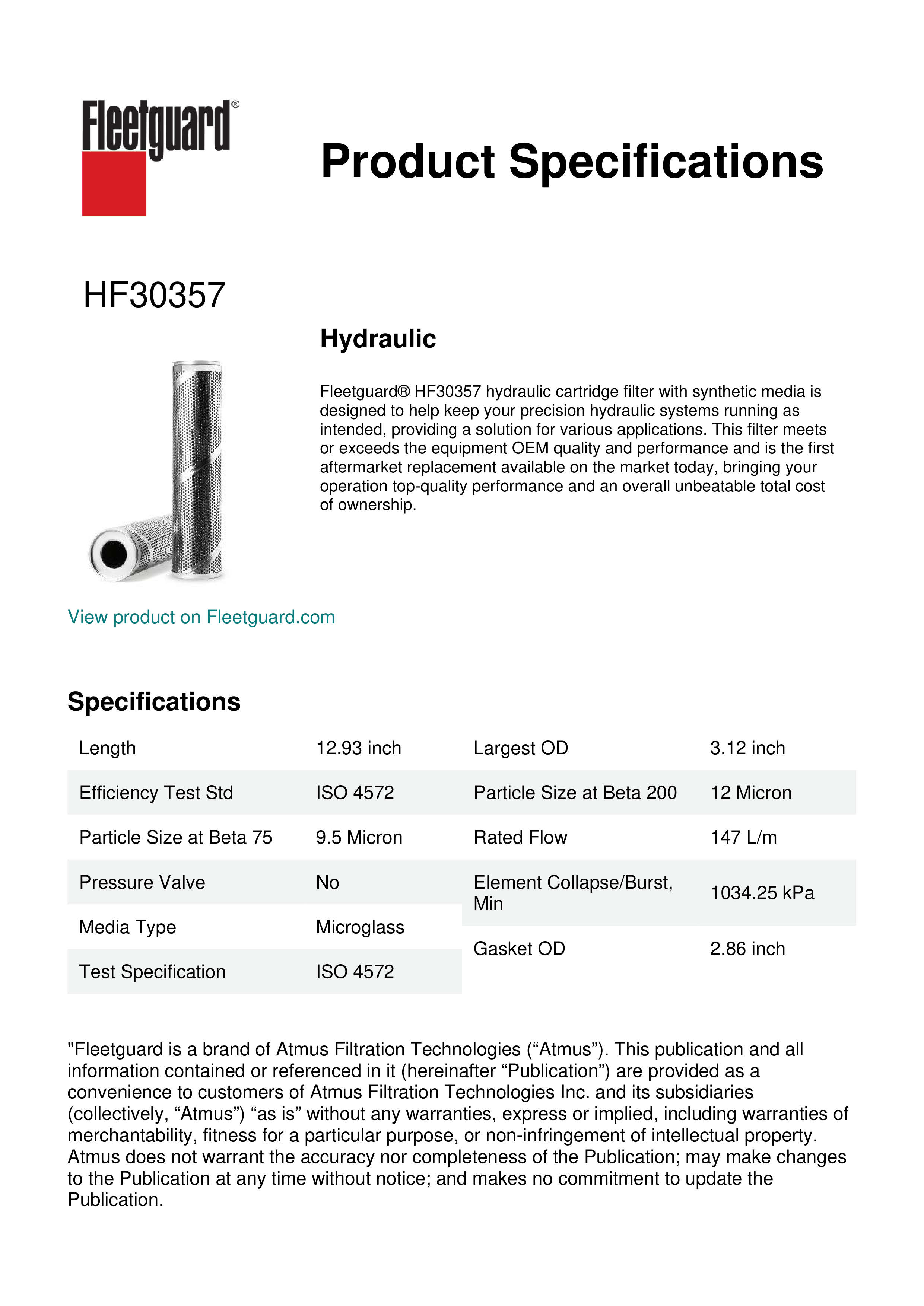 Fleetguard® HF30357 hydraulic cartridge filter with synthetic media is designed to help keep your precision hydraulic systems running as intended, providing a solution for various applications. This filter meets or exceeds the equipment OEM quality and performance and is the first aftermarket replacement available on the market today, bringing your operation top-quality performance and an overall unbeatable total cost of ownership.Specification