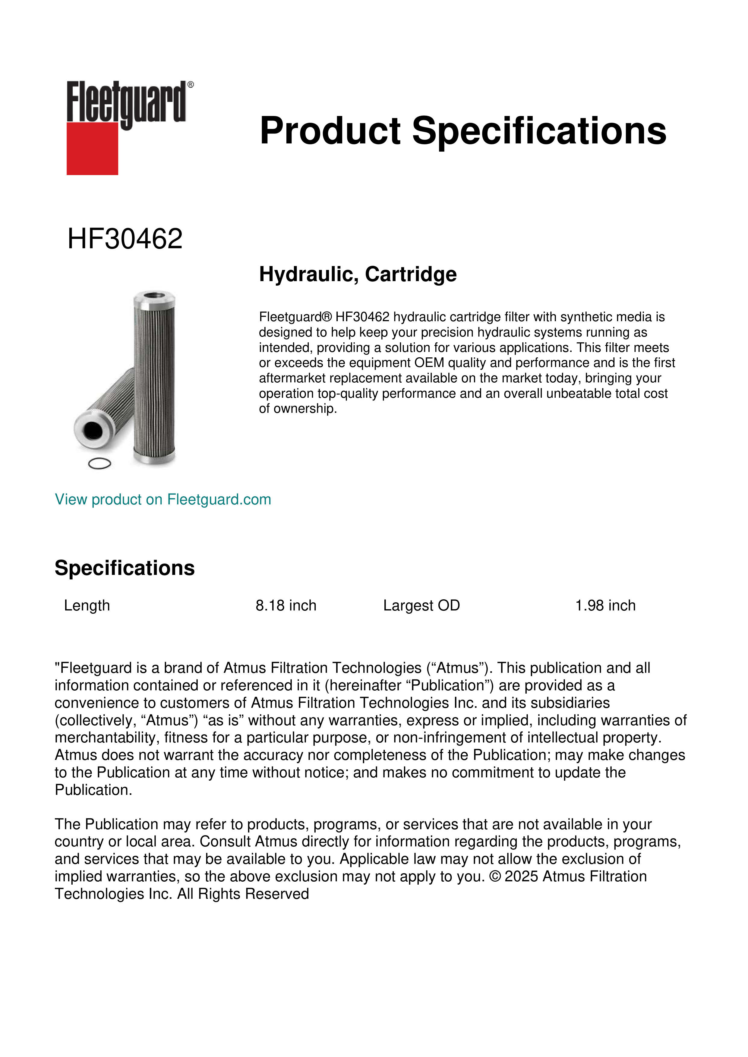 Fleetguard® HF30462 hydraulic cartridge filter with synthetic media is designed to help keep your precision hydraulic systems running as intended, providing a solution for various applications. This filter meets or exceeds the equipment OEM quality and performance and is the first aftermarket replacement available on the market today, bringing your operation top-quality performance and an overall unbeatable total cost of ownership.Specification