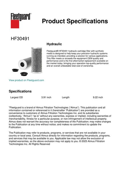 Fleetguard® HF30491 hydraulic cartridge filter with synthetic media is designed to help keep your precision hydraulic systems running as intended, providing a solution for various applications. This filter meets or exceeds the equipment OEM quality and performance and is the first aftermarket replacement available on the market today, bringing your operation top-quality performance and an overall unbeatable total cost of ownership.Specification